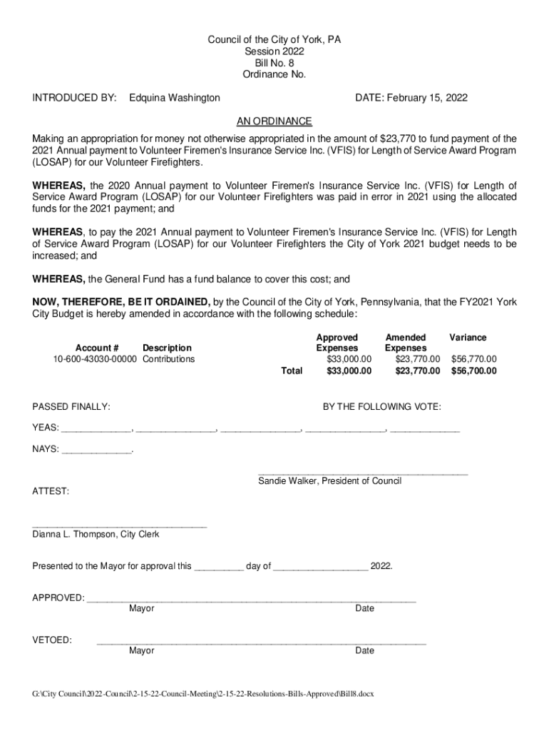 AN ORDINANCEMaking an appropriation for money not otherwise appropriated