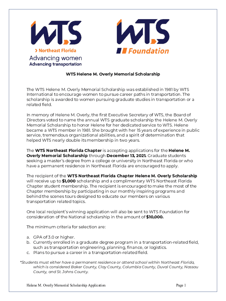 WAS Helene M. Overly Memorial Scholarship The WAS Helene M. Overly Memorial Scholarship was established in 1981 by WAS International to encourage women to pursue career paths in transportation. The