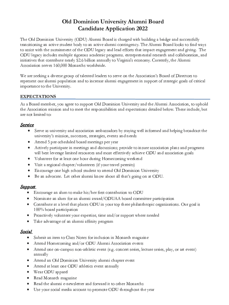 Individuals who wish to apply for board membership or leadership positions within the ODU alumni association.