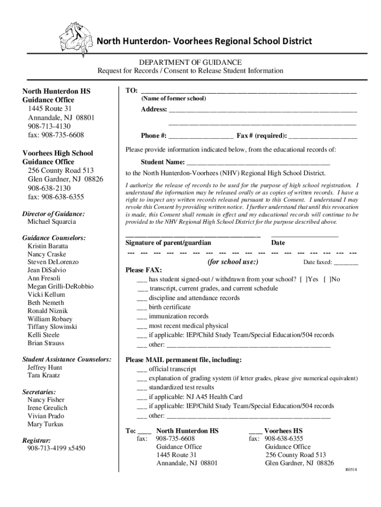 Students enrolled in North Hunterdon Regional High School need to file various forms such as enrollment, health records, and other documentation required by the school administration.
