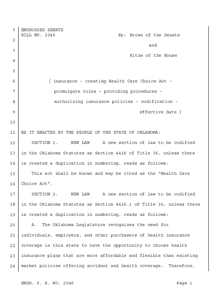 1ENGROSSED SENATE BILL NO. 2046By: Brown of the Senate2 and 3 Ritze of the House 4 5 [ insurance creating Health Care Choice Act 6 7promulgate rules providing procedures 8authorizing insurance policies