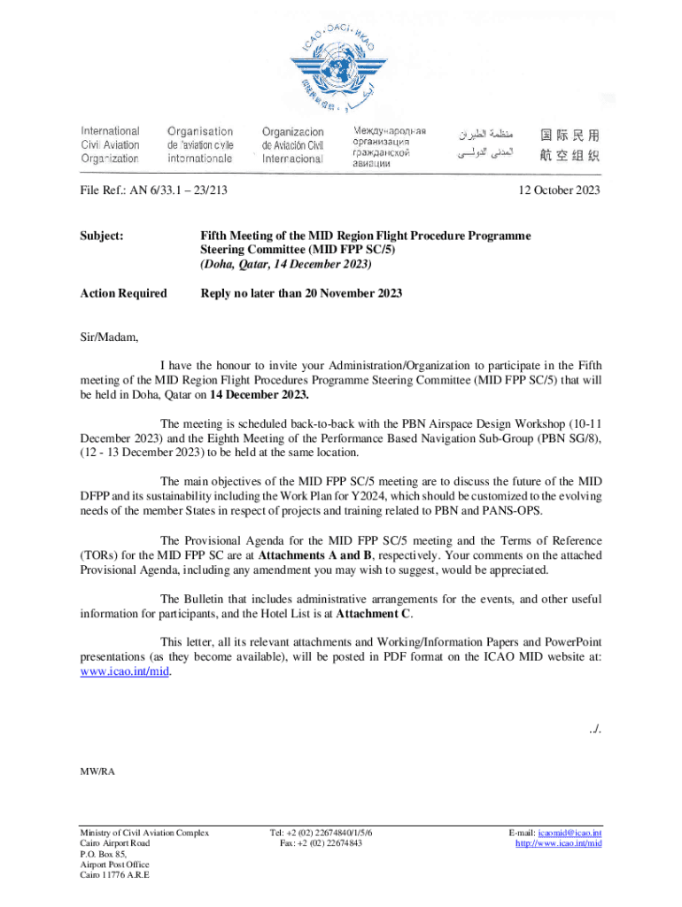 File Ref.: AN 6/33.1 23/21312 October 2023Subject:Fifth Meeting of the MID Region Flight Procedure Program