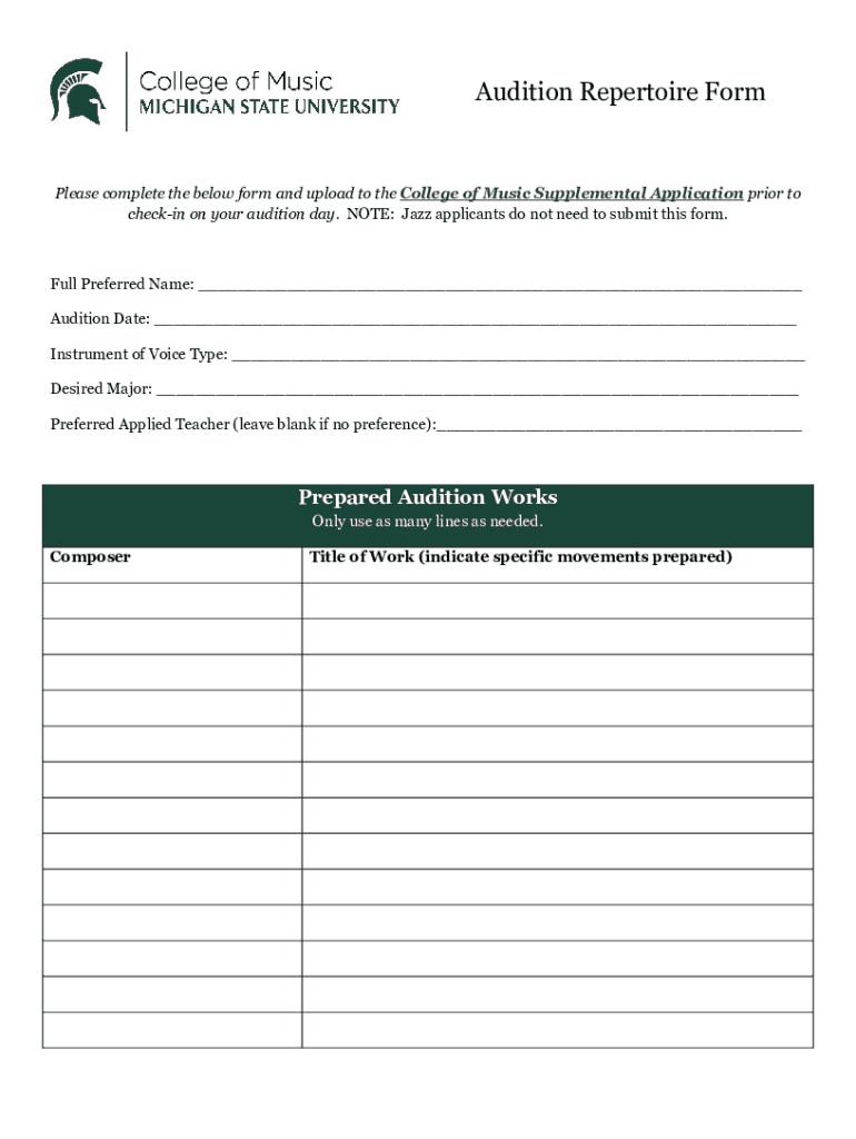 To fill out the audition repertoire form, you should provide details such as your name, contact information, the titles and composers of the pieces you plan to perform, and any additional notes specific to your audition.