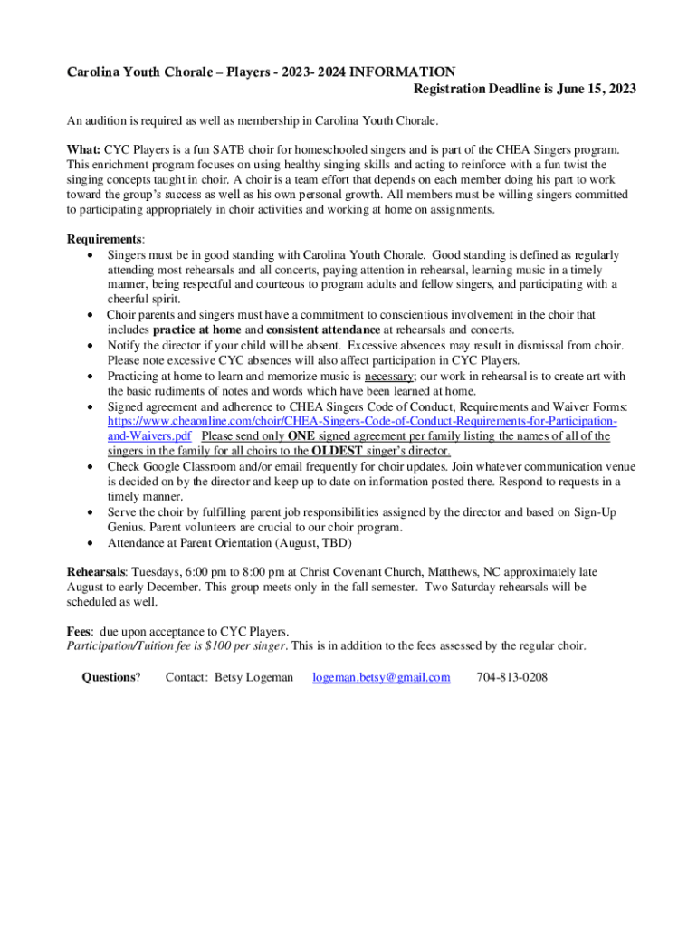 Carolina Youth Chorale Players 2023 2024 INFORMATION Registration Deadline is June 15, 2023 An audition is required as well as membership in Carolina Youth Chorale. What: CYC Players is a fun SATB