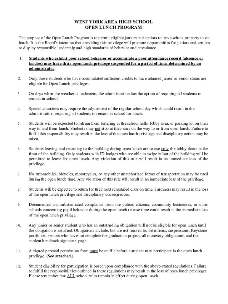 The purpose of the Open Lunch Program is to permit eligible juniors and seniors to leave school property to eat