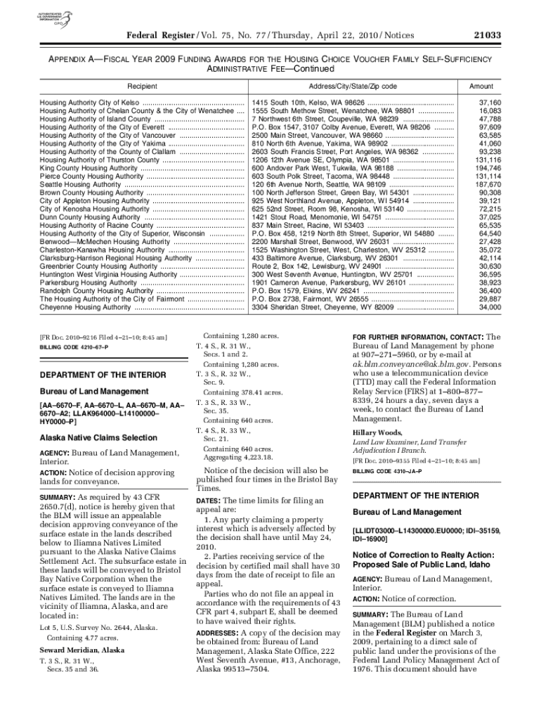 Federal Register / Vol. 75, No. 77 / Thursday, April 22, 2010 / Notices21033APPENDIX FISCAL YEAR 2009 FUNDING AWARDS FOR THE HOUSING CHOICE VOUCHER FAMILY SELF-SUFFICIENCY