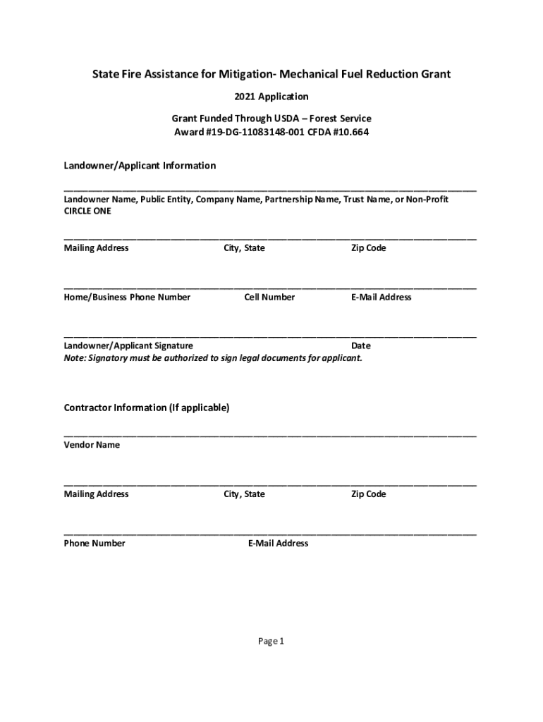 State Fire Assistance for Mitigation Mechanical Fuel Reduction Grant 2021 Application Grant Funded Through USDA Forest Service Award #19DG11083148001 CFDA #10.664 Scope of Project: Reduce the risk