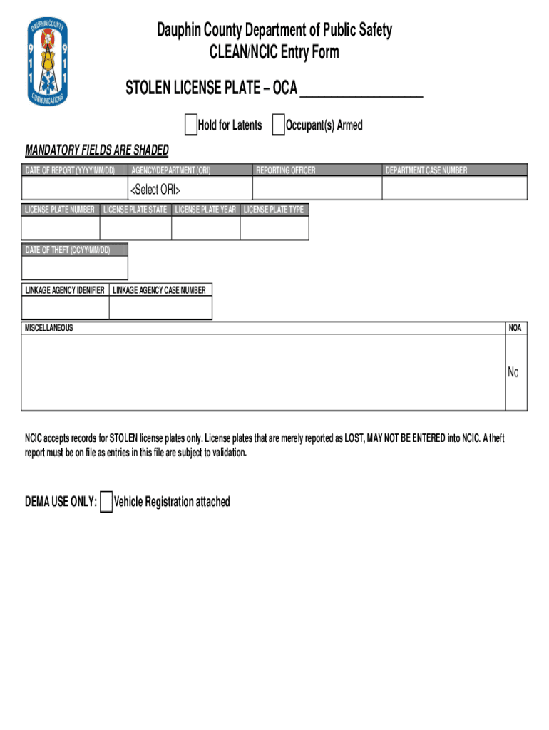 Email, fax, or share your cleanncic stolen license plate form via URL. You can also download, print, or export forms to your preferred cloud storage service.