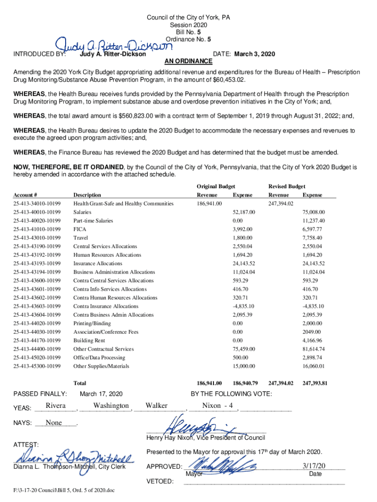 AN ORDINANCEAmending the 2020 York City Budget appropriating additional