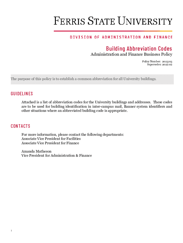 Building Abbreviation CodesAdministration and Finance Business Policy Number: 2023:03