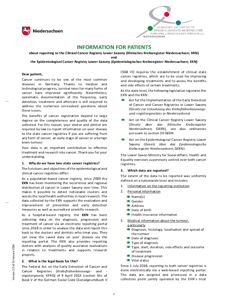 INFORMATION FOR PATIENTS about reporting to the Clinical Cancer Registry Lower Saxony (Finishes Krebs register Niedersachsen; KIN)