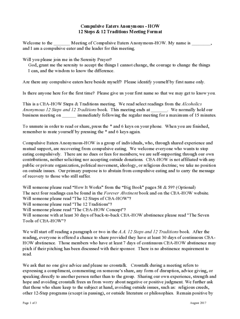 Compulsive Eaters Anonymous HOW 12 Steps & 12 Traditions Meeting Format Welcome to the ___ Meeting of Compulsive Eaters AnonymousHOW. My name is ___, and I am a compulsive eater and the leader for