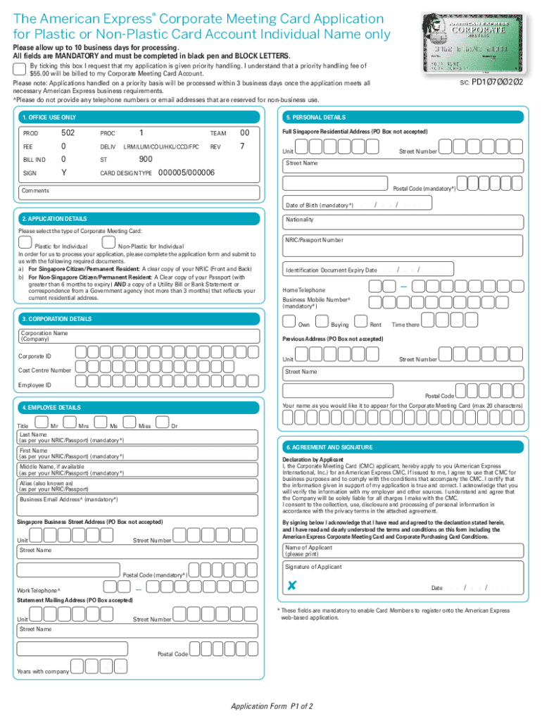 The American Express Corporate Meeting Card Application for Plastic or NonPlastic Card Account Individual Name only Please allow up to 10 business days for processing. All fields are MANDATORY and