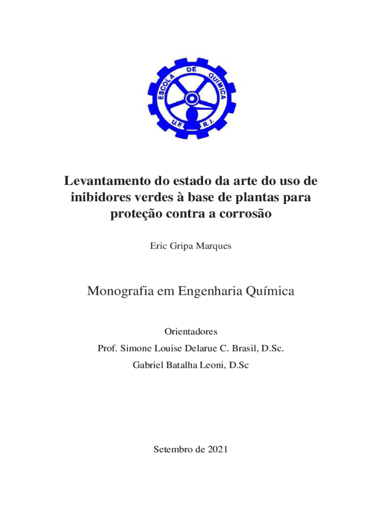 Levantamento do estado da arte do uso de inibidores verdes base de plantas para proteo contra a corroso Eric Gripa MarquesMonografia em Engenharia Qumica Orientadores Prof. Simone Louise Delarue C.