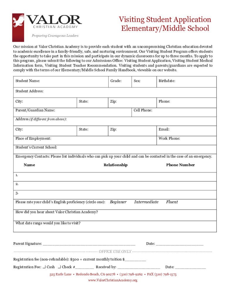 Get the free Visiting Student Application Elementary/Middle School