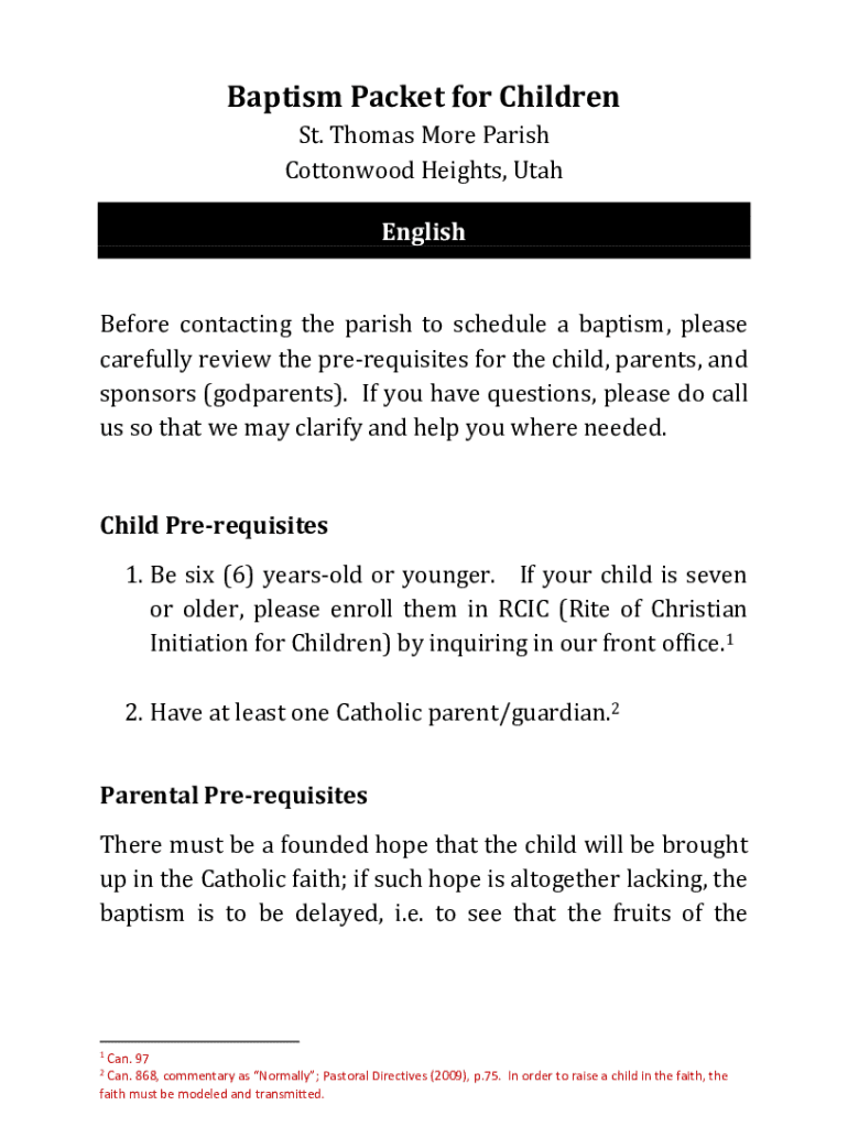 Baptism Packet for Children St. Thomas More Parish Cottonwood Heights, Utah English Before contacting the parish to schedule a baptism, please carefully review the prerequisites for the child, parents,
