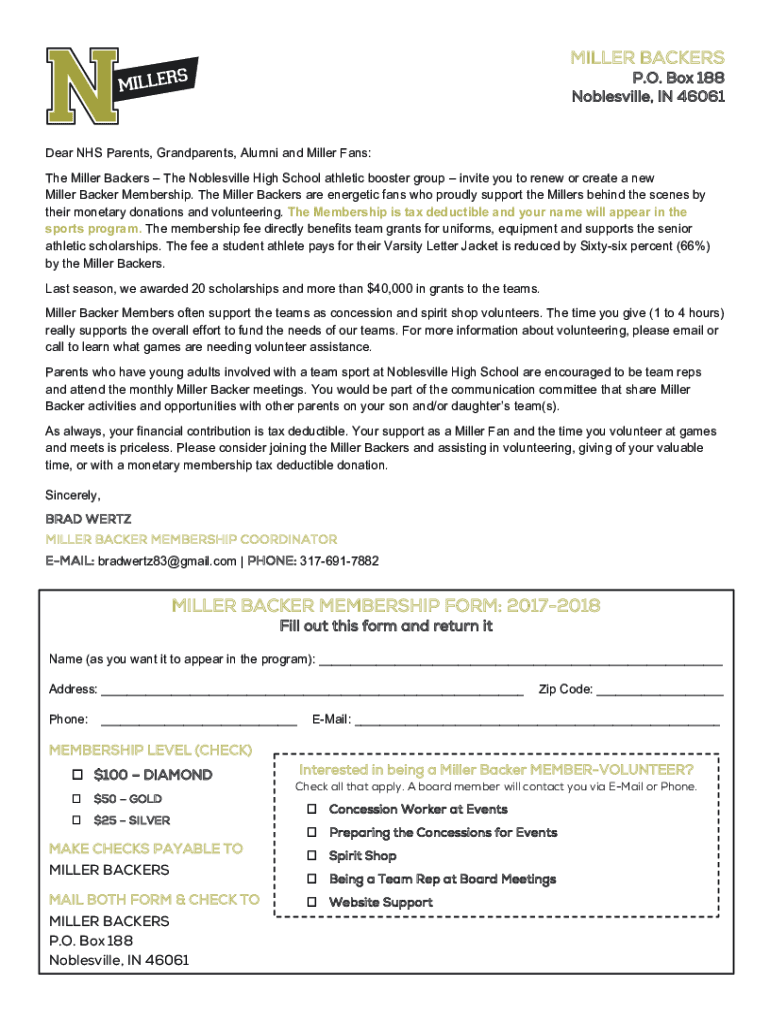 MILLER BACKERS P.O. Box 188 Noblesville, IN 46061Dear NHS Parents, Grandparents, Alumni and Miller Fans: The Miller Backers The Noblesville High School athletic booster group invite you to renew or