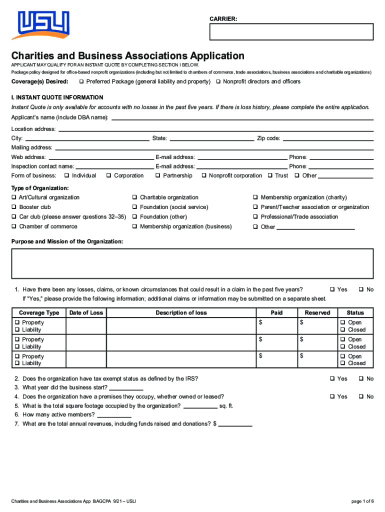 APPLICANT MAY QUALIFY FOR AN INSTANT QUOTE BY COMPLETING SECTION I BELOW. Package policy designed for ceased nonprofit organizations (including
