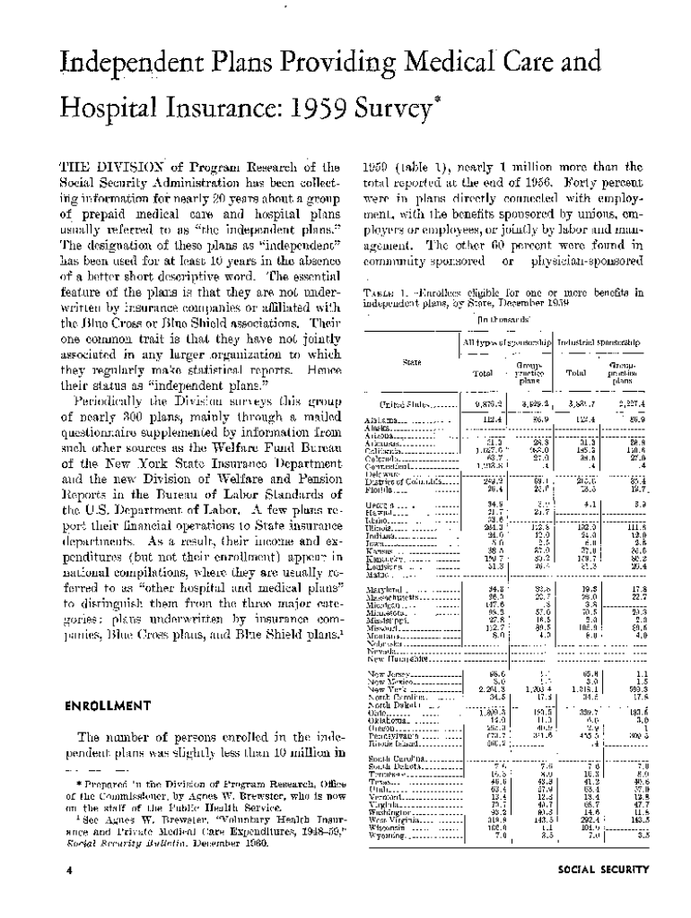 Independent Plans ProvidingMedical Care hospital Insurance: 1959 Survey