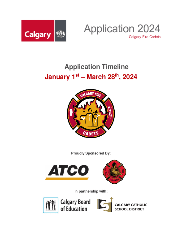 Application 2024 Calgary Fire CadetsApplication Timeline January 1st March 28th, 2024Proudly Sponsored By:In partnership with:Table of Contents APPLICATION PROCESS .........................................................................................................1