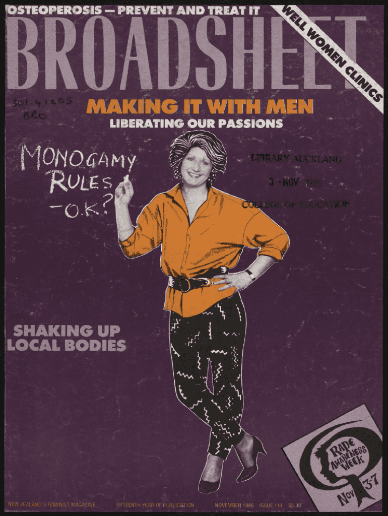 #//////SHAKING UP LOCAL BODIESNEW ZEALAND\'S FEMINIST MAGAZINEFIFTEENTH YEAR OF PUBLICATIONNOVEMBER 1986ISSUE 144$3.30Women Writing the Wrongs*Sl f\'HELP KEEP YOUR FEMINIST BOOKSHOP OPEN BUY YOUR