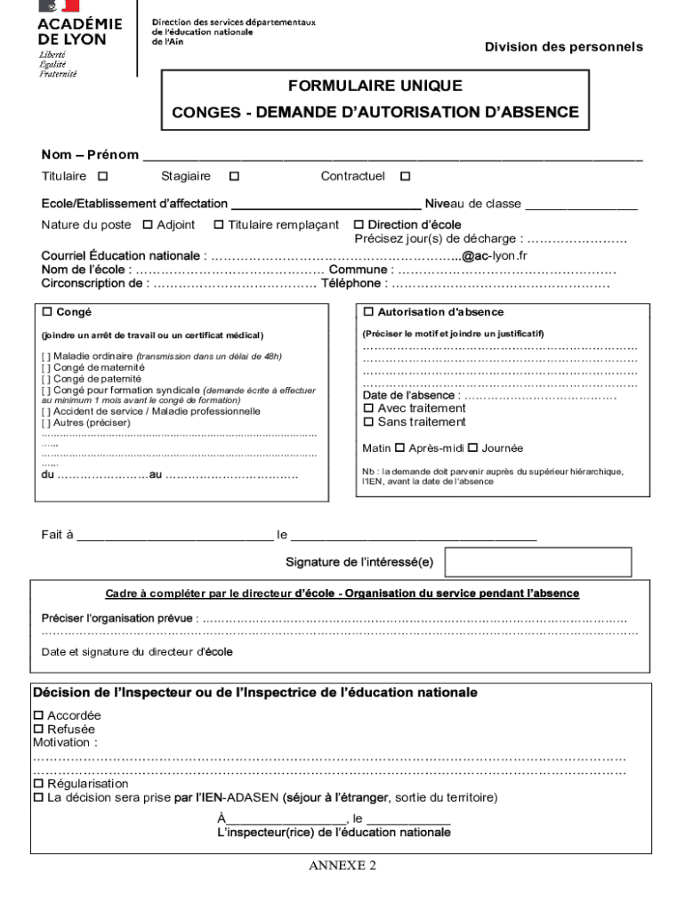 Division des personnelsFORMULAIRE UNIQUE CONGES NomPrnom ___TitulaireStagiaireContractuel au de classe ___Nature du posteAdjointTitulaire remplaant Prcisez jour(s) de dcharge lyon.frCongAutorisation