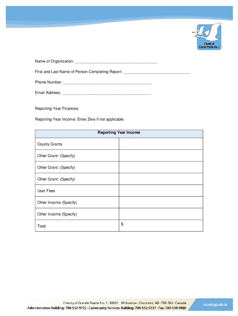 Name of Organization: ___ First and Last Name of Person Completing Report: ___ Phone Number: ___ Email Address: ___Reporting Year Finances: Reporting Year Income: Enter Zero if not applicable. Reporting
