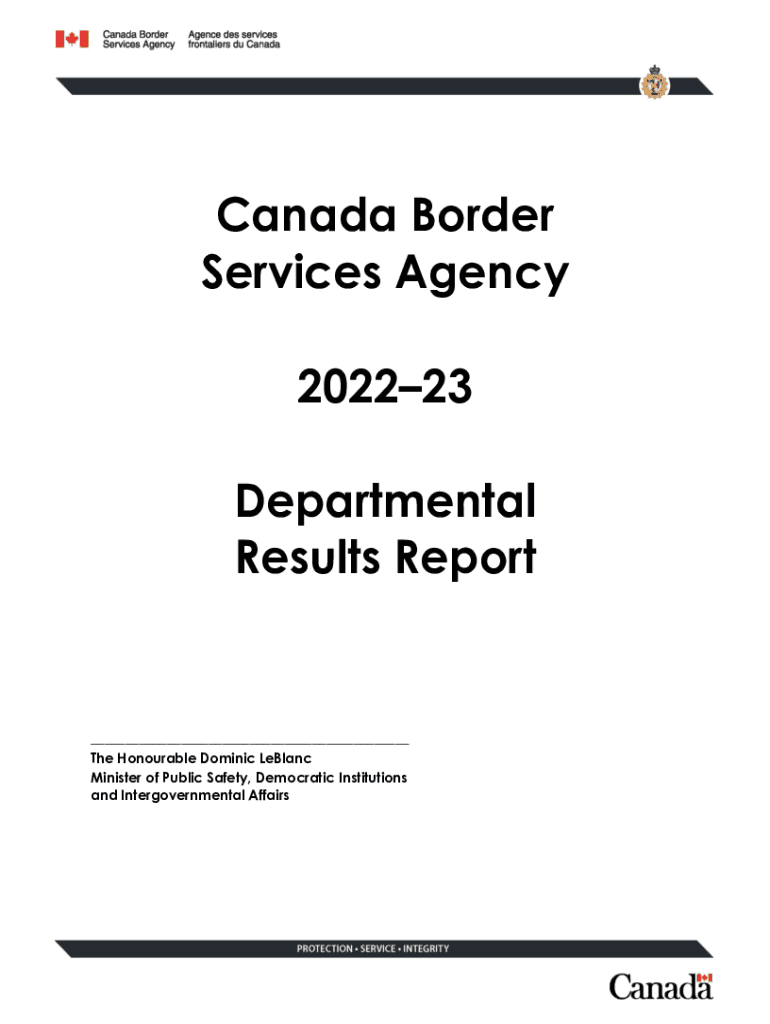 Canada Border Services Agency 202223Departmental Results Report___ The Honourable Dominic LeBlanc Minister of Public Safety, Democratic Institutions and Intergovernmental Affairs His Majesty the King