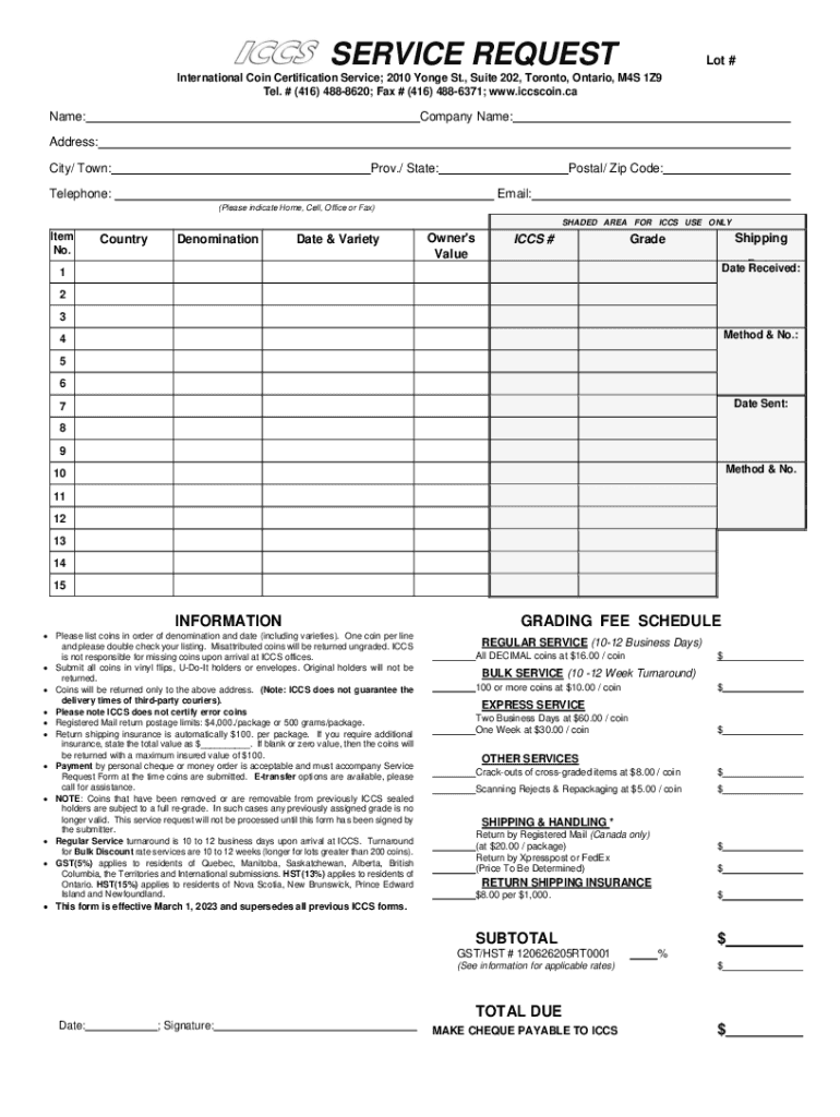 SERVICE REQUESTLot #International Coin Certification Service; 2010 Yonge St., Suite 202, Toronto, Ontario, M4S 1Z9 Tel. # (416) 4888620; Fax # (416) 4886371; www.iccscoin.caName:Company Name:Address: