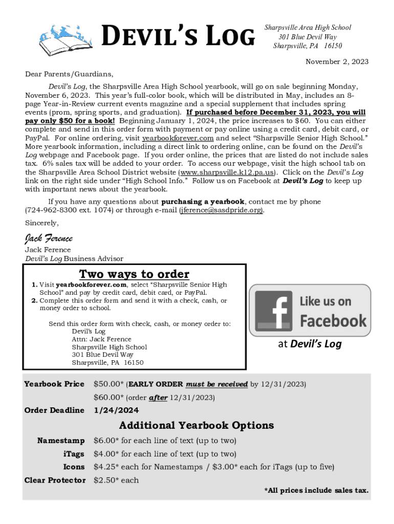 Devils Log, the Sharpeville Area High School yearbook, will go on sale beginning