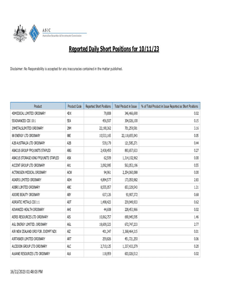 Reported Daily Short Positions for 10/11/23 Disclaimer: No Responsibility is accepted for any inaccuracies contained in the matter published.ProductProduct CodeReported Short PositionsTotal Product