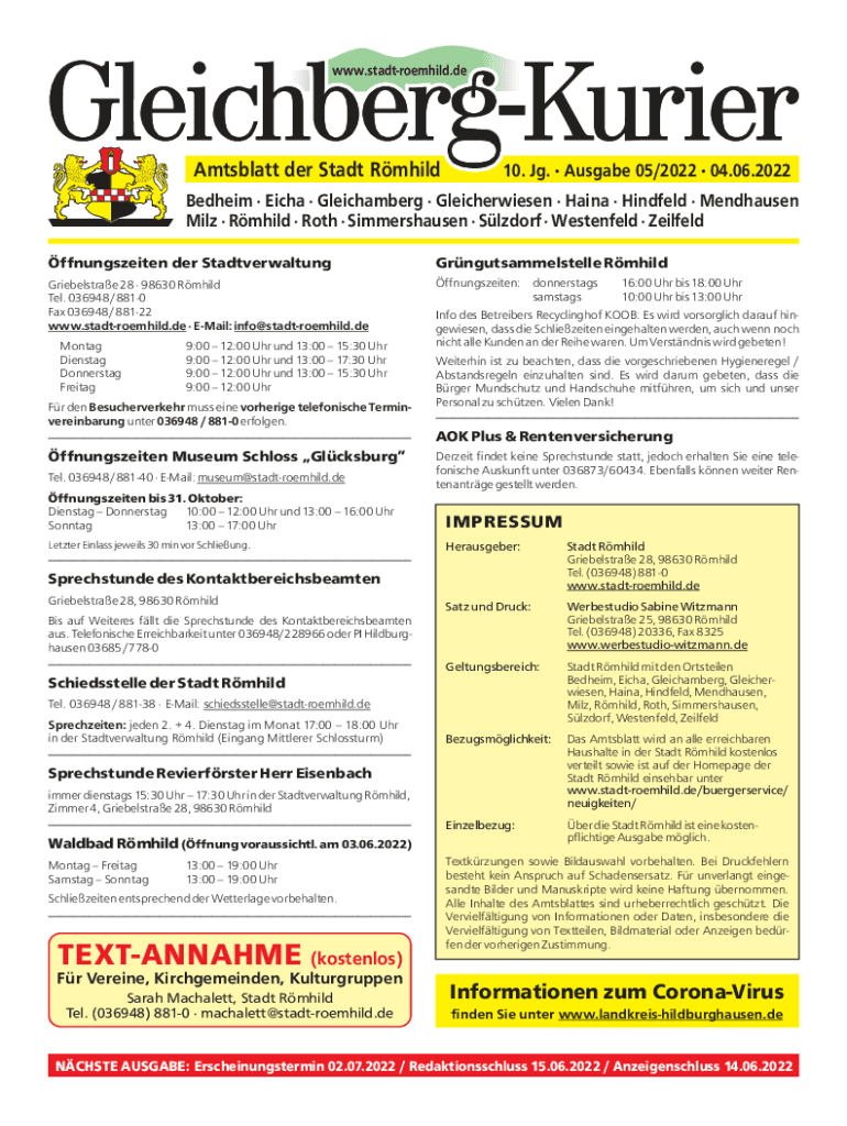 GleichbergKurier www.stadtroemhild.deAmtsblatt der Stadt Rmhild10. Jg.Ausgabe 05/202204.06.2022Bedheim Eicha Gleichamberg Gleicherwiesen Haina Hindfeld Mendhausen Milz Rmhild Roth Simmershausen Slzdorf