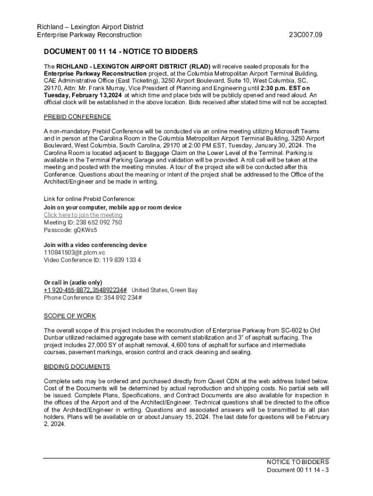 Enterprise Parkway Reconstruction23C007.09DOCUMENT 00 11 14 NOTICE TO BIDDERS