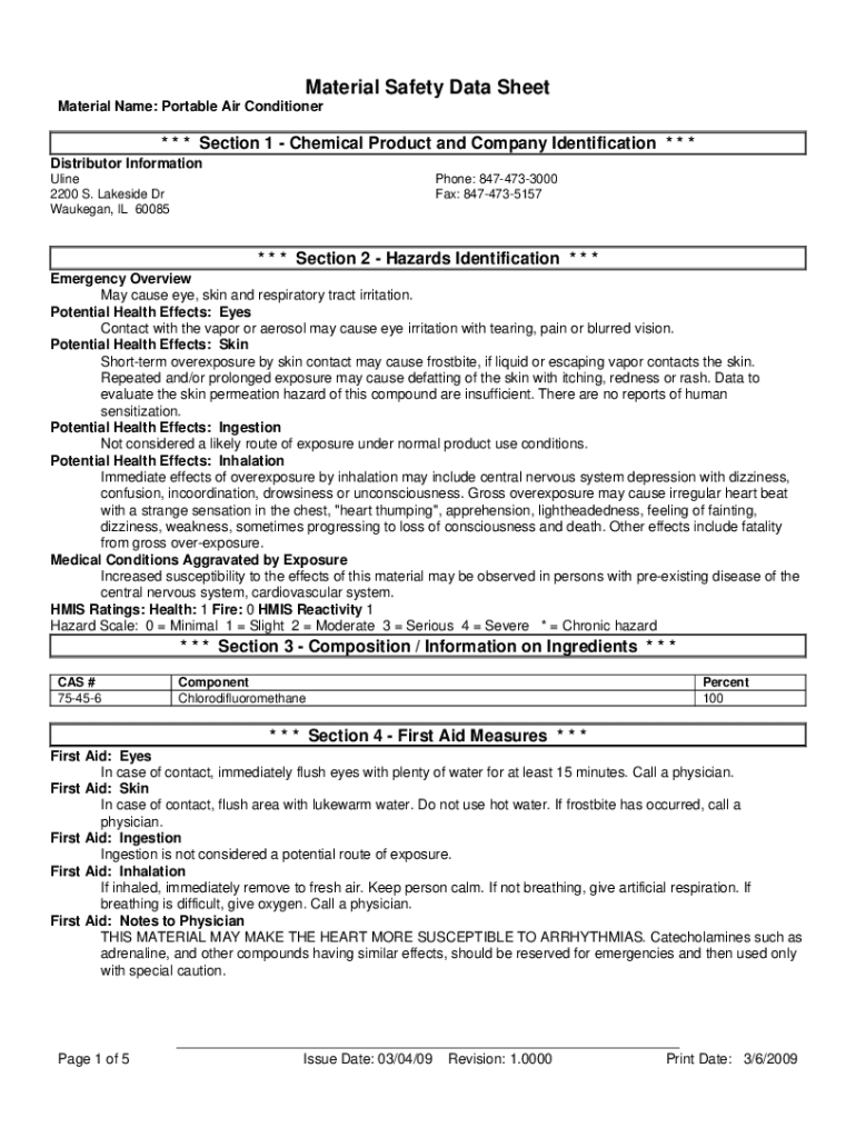 Material Safety Data Sheet Material Name: Portable Air Conditioner* * * Section 1 Chemical Product and Company Identification * * * Distributor Information Uline 2200 S. Lakeside Dr Waukegan, IL 60085Phone: