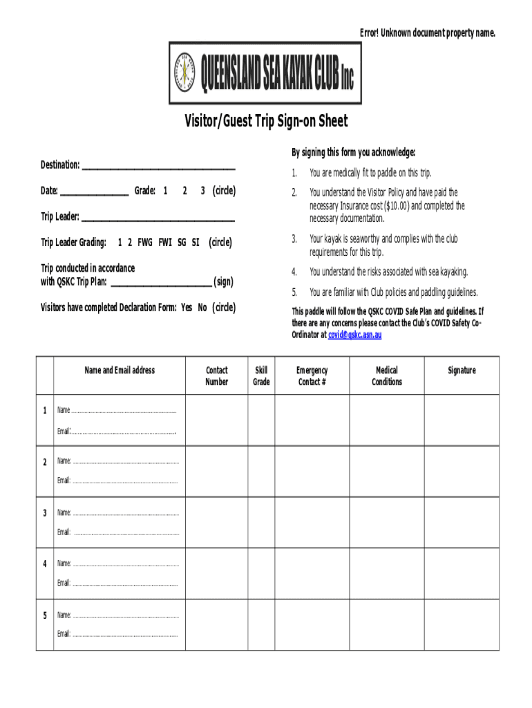Error! Unknown document property name.Visitor/Guest Trip Signon Sheet By signing this form you acknowledge:Destination: ___1.You are medically fit to paddle on this trip.2.You understand the Visitor
