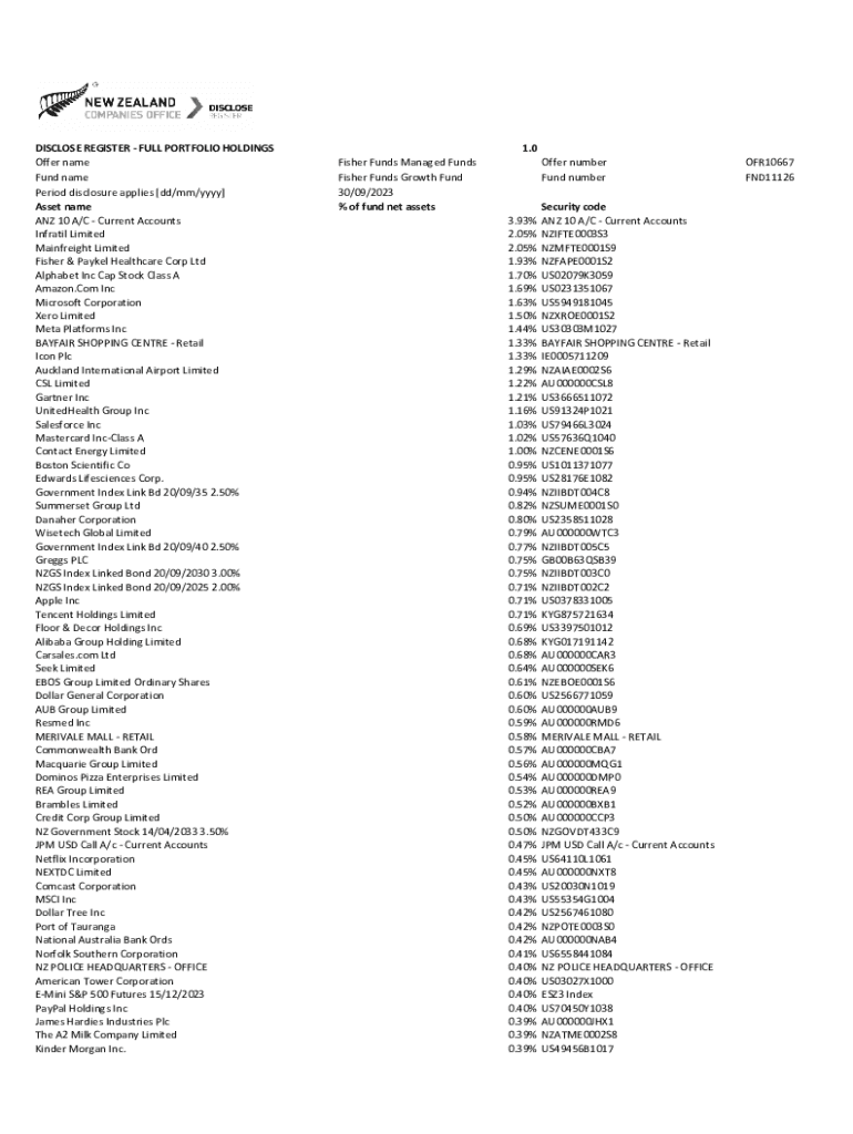DISCLOSE REGISTER FULL PORTFOLIO HOLDINGS Offer name Fund name Period disclosure applies [dd/mm/yyyy] Asset name ANZ 10 A/C Current Accounts Infratil Limited Mainfreight Limited Fisher & Paykel Healthcare