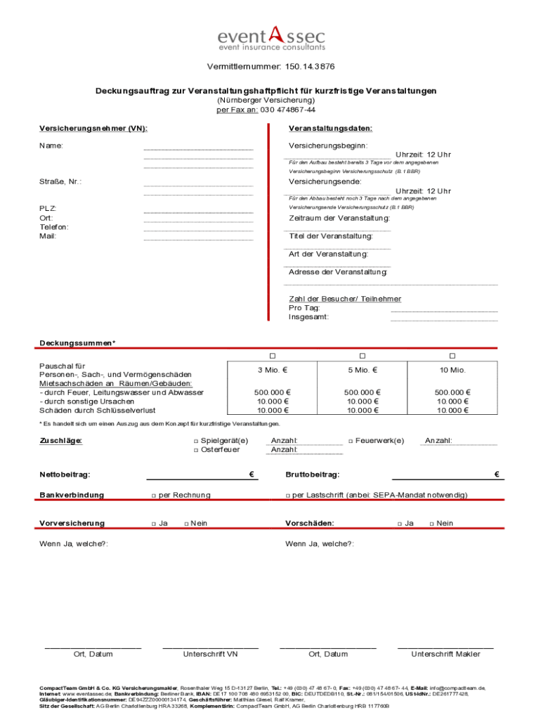 Vermittlernummer: 150.14.3876 Deckungsauftrag zur Veranstaltungshaftpflicht fr kurzfristige Veranstaltungen (Nrnberger Versicherung) per Fax an: 030 47486744 Versicherungsnehmer (VN):Veranstaltungsdaten:Name:Versicherungsbeginn: