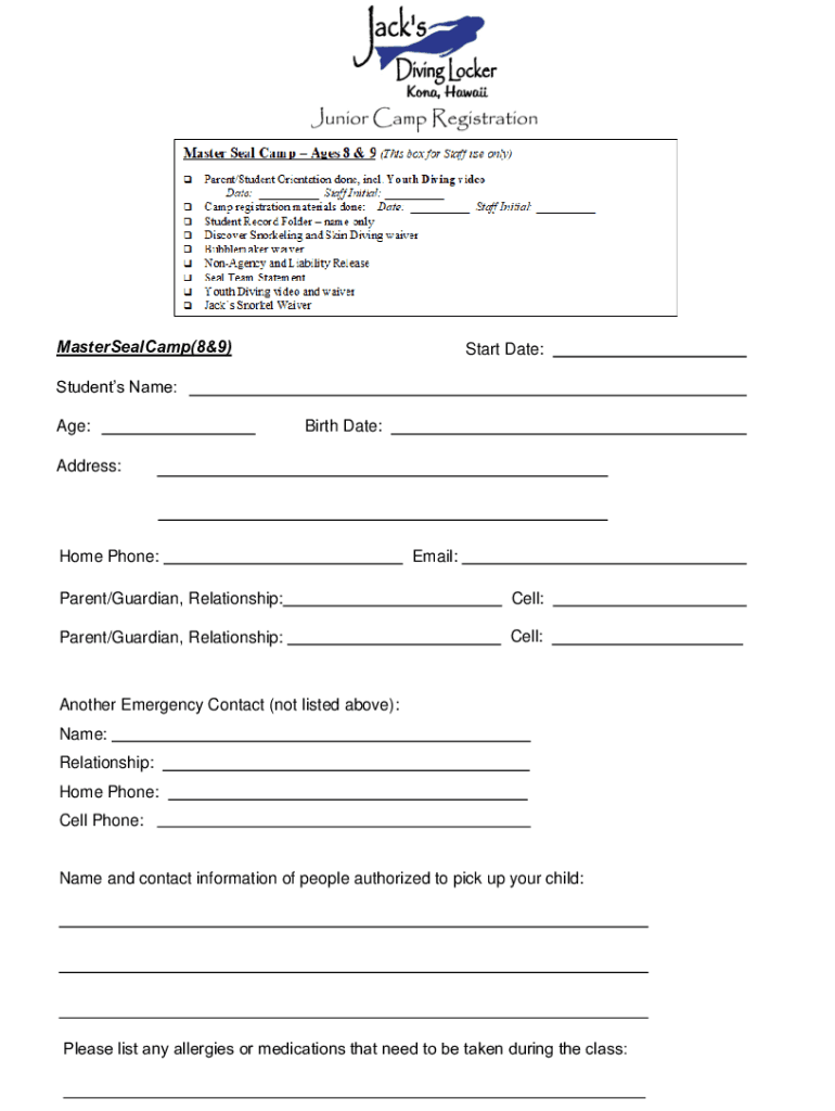 Master Seal Camp (8&9)Start Date:Students Name: Age:Birth Date:Address:Home Phone:Email:Parent/Guardian, Relationship:Cell:Parent/Guardian, Relationship:Cell:Another Emergency Contact (not listed
