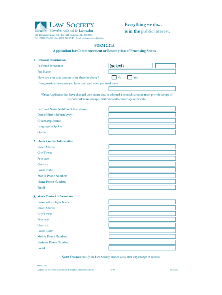 Everything we do... is in the public interest.196198 Water Street, P.O. Box 1028, St. Johns, NL, A1C 5M3 Tel: (709) 7224740 | Fax: (709) 7228902 | Email: thelawsociety@lsnl.caFORM 2.21A Application