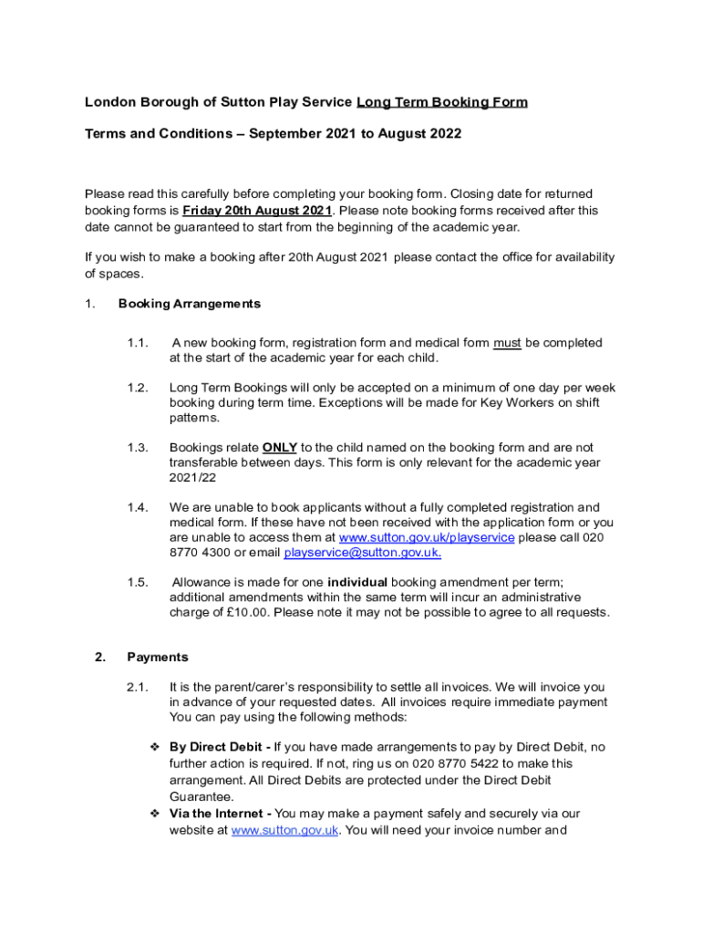 London Borough of Sutton Play Service Long Term Booking Form Terms and Conditions September 2021 to August 2022Please read this carefully before completing your booking form. Closing date for returned