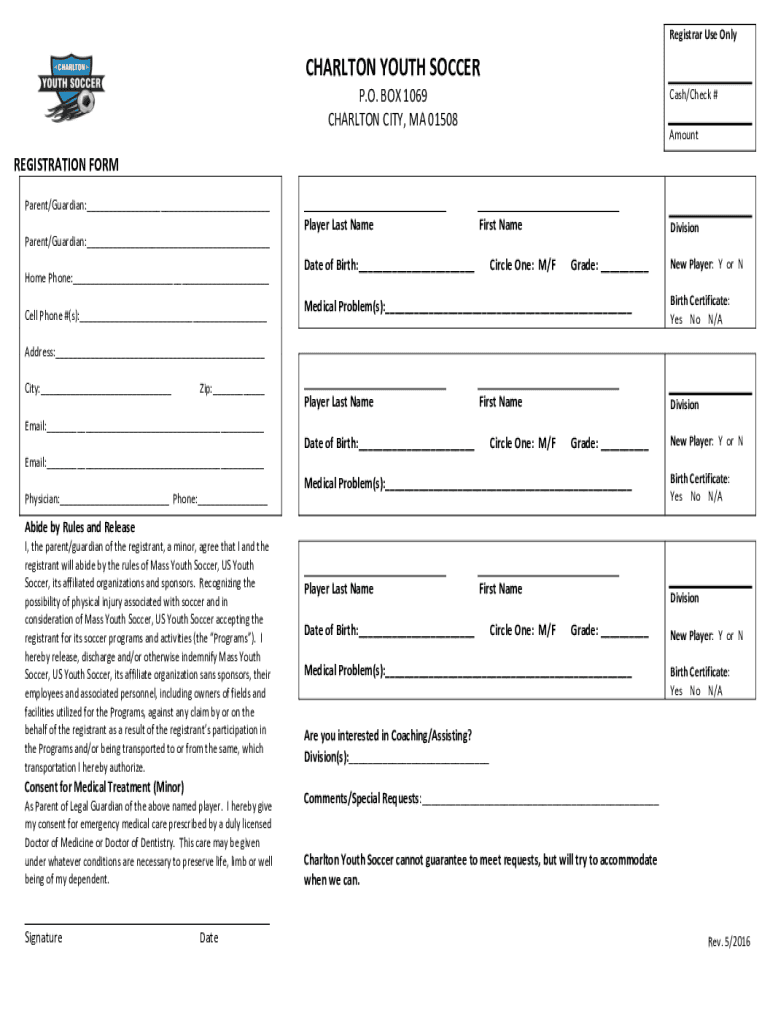 Registrar Use OnlyCHARLTON YOUTH SOCCER P.O. BOX 1069 CHARLTON CITY, MA 01508Cash/Check # AmountREGISTRATION FORM Parent/Guardian:___Player Last NameFirst NameDivisionParent/Guardian:___ Home Phone:___