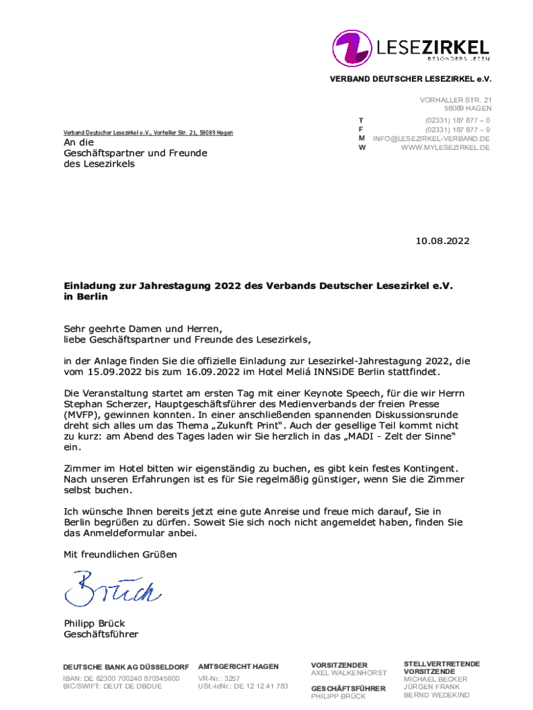 VERBAND DEUTSCHER LESEZIRKEL e.V. VORHALLER STR. 21 58089 HAGENVerband Deutscher Lesezirkel e.V., Vorhaller Str. 21, 58089 HagenAn die Geschftspartner und Freunde des LesezirkelsT F M W(02331) 187