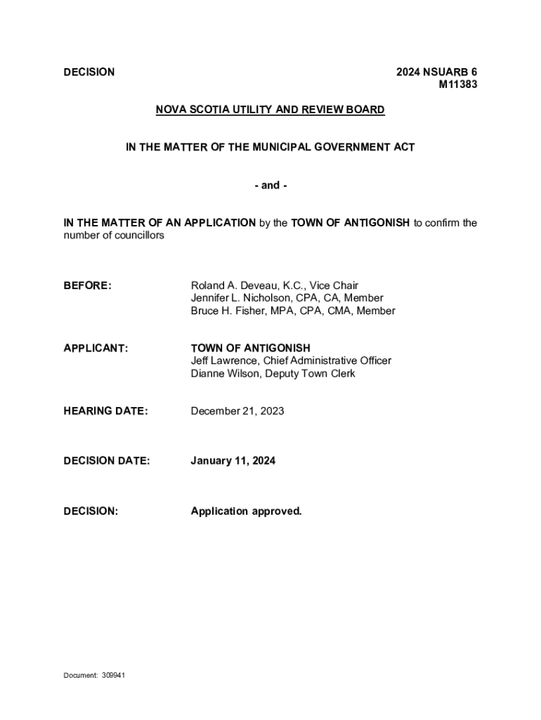 DECISION2024 NSUARB 6 M11383 NOVA SCOTIA UTILITY AND REVIEW BOARD IN THE MATTER OF THE MUNICIPAL GOVERNMENT ACT and IN THE MATTER OF AN APPLICATION by the TOWN OF ANTIGONISH to confirm the number