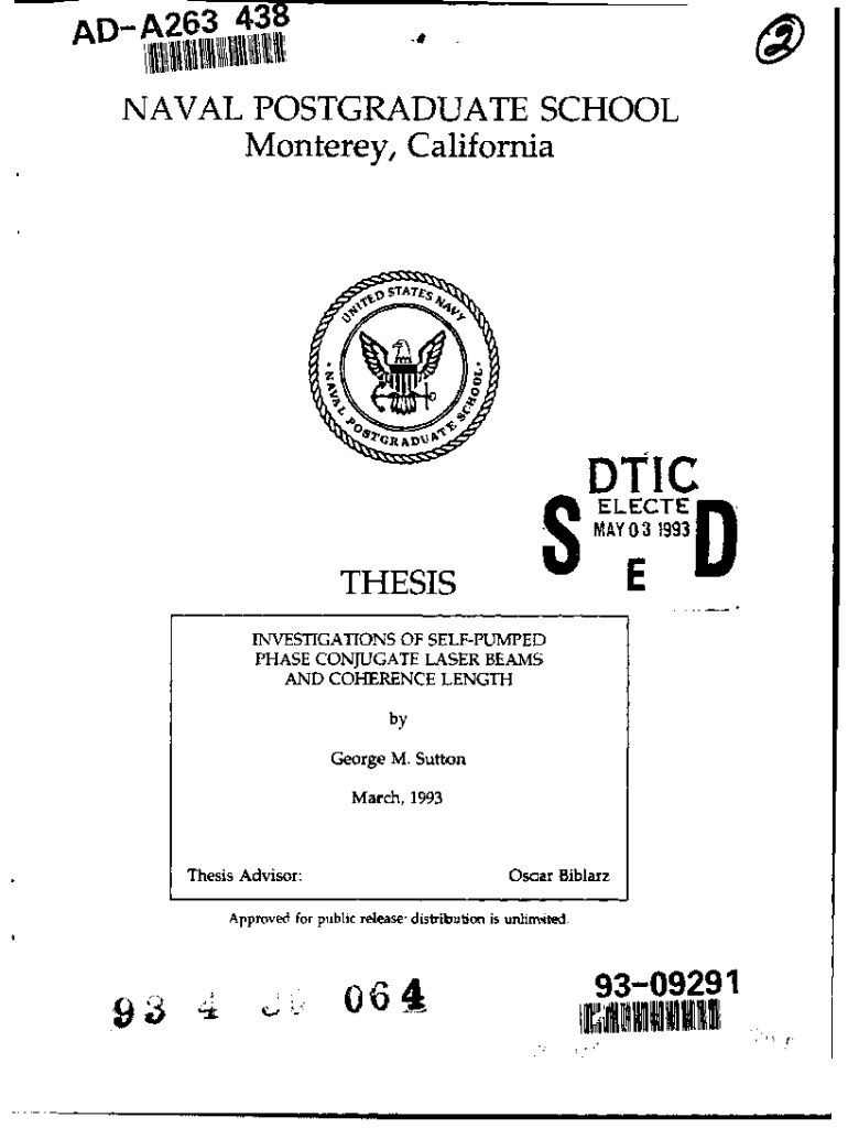 AD A26 3 438 NAVAL POSTGRADUATE SCHOOL Monterey, CaliforniaDTIC ELECTE MAY03 19931ETHESIS__11INVESTIGATIONS OF SELFPUMPED PHASE CONJUGATE LASER BEAMS AND COHIERENCE LENGTH by George M. Sutton March,