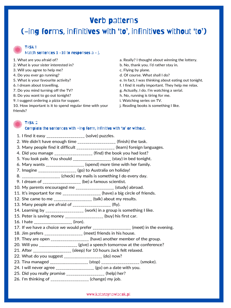 Verb patterns (ing forms, infinitives with to, infinitives without to) TASK ! Match sentences 1 10 to responses a j. 1. What are you afraid of? 2. What is your sister interested in? 3. Will you agree