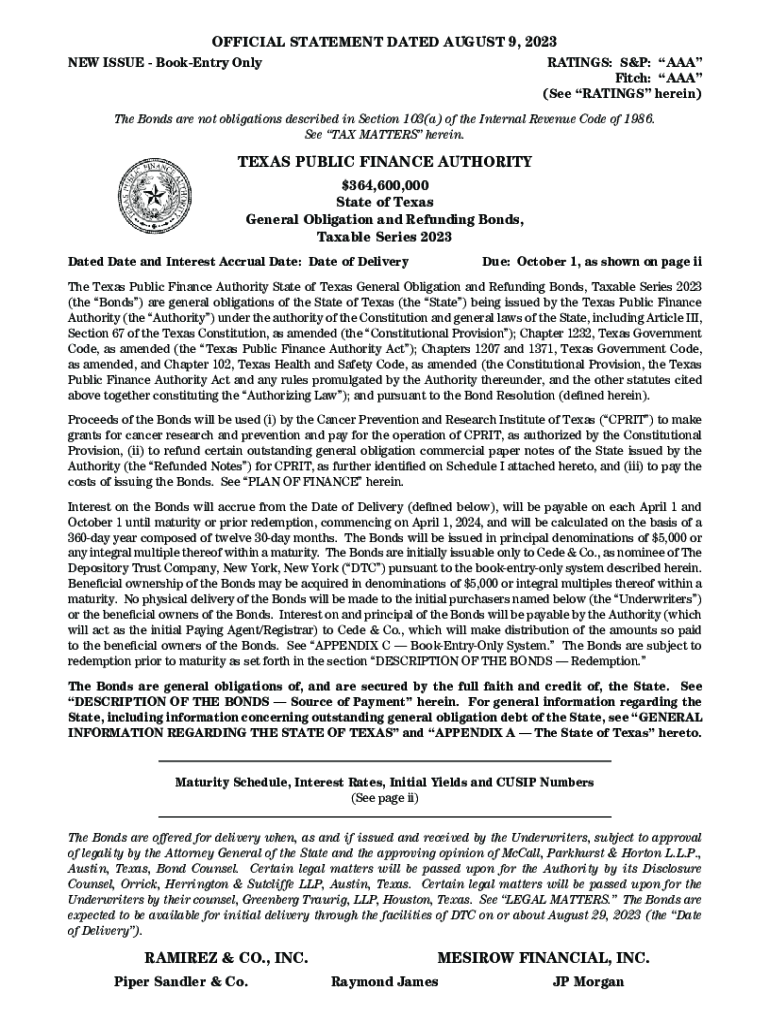 OFFICIAL STATEMENT DATED AUGUST 9, 2023 NEW ISSUE BookEntry OnlyRATINGS: S&P: AAA Fitch: AAA (See RATINGS herein)The Bonds are not obligations described in Section103(a)of the Internal Revenue Code