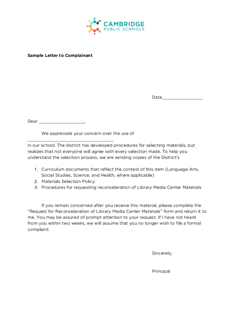 Sample Letter to ComplainantDate___Dear ___, We appreciate your concern over the use of ___ in our school. The district has developed procedures for selecting materials, but realizes that not everyone