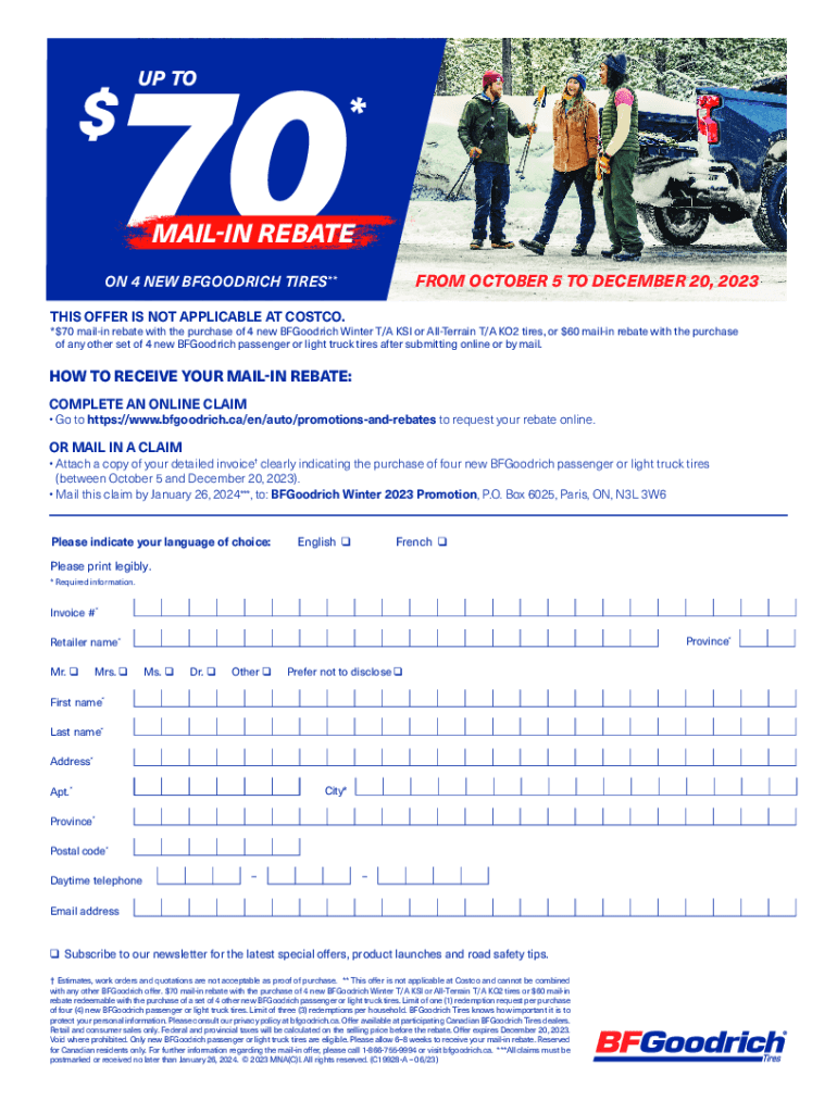 70$UP TO*MAILIN REBATE FROM OCTOBER 5 TO DECEMBER 20, 2023ON 4 NEW BFGOODRICH TIRES**THIS OFFER IS NOT APPLICABLE AT COSTCO.*$70 mailin rebate with the purchase of 4 new BFGoodrich Winter T/A KSI