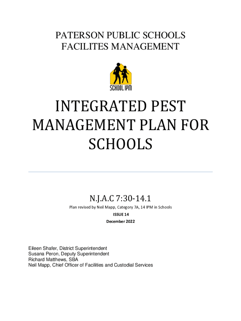 PATERSON PUBLIC SCHOOLS FACILITES MANAGEMENTINTEGRATED PEST MANAGEMENT PLAN FOR SCHOOLS N.J.A.C 7:3014.1 Plan revised by Neil Mapp, Category 7A, 14 IPM in Schools ISSUE 14 December 2022Eileen Shafer,