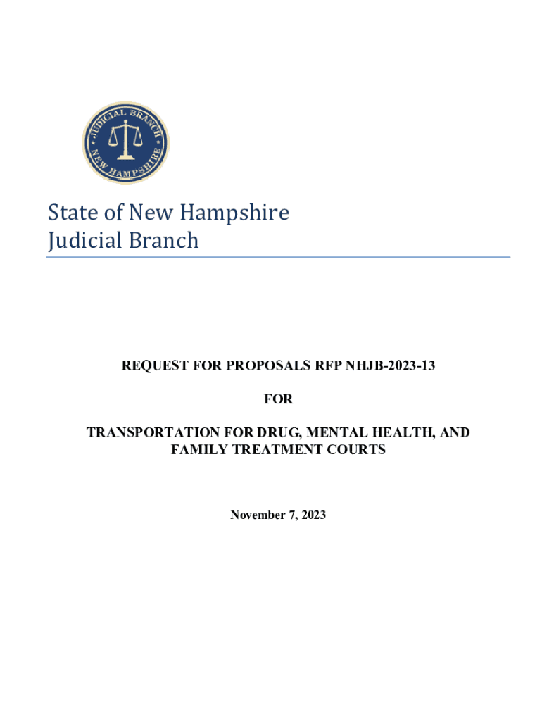 State of New Hampshire Judicial Branch REQUEST FOR PROPOSALS RFP NHJB202313 FOR TRANSPORTATION FOR DRUG, MENTAL HEALTH, AND FAMILY TREATMENT COURTSNovember 7, 2023NEW HAMPSHIRE JUDICIAL BRANCH RFP